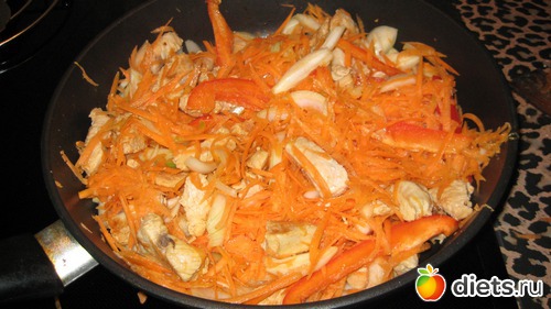 Добавить на сковородку нарезанные лук (перьями), сладкий перец (длинными полосками), натертую морковь (лучше на терке для корейской моркови). Все вместе прогреть не более 2-3 минут, затем влить на сковородку смесь соевого соуса с медом, перемешать и дать испариться лишней жидкости - не более 1-2 минут.