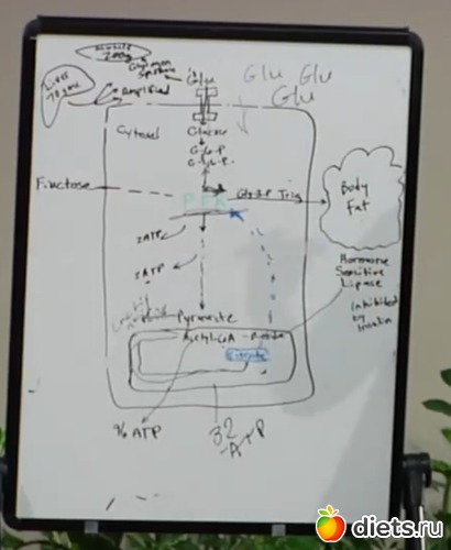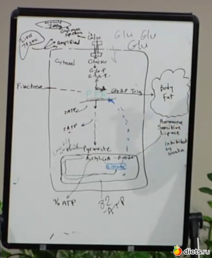 Все начинается с поступления глюкозы в клетку, которую туда пропускает инсулин (действие в клетке "с верху в низ" инсулин он обозначил ее знаком "I" в самом верху клетки) Через многие процессы из нее делаются фосфаты которые являются нашей энергией ( что-то типо био-дизеля ) Наша оригинальная клетка быстро конвертирует глюкозу, а вот митохондрия нет. (почему и коков вторичный продукт объяснять не стану) Мы приходим к тому что клетка уже забита по горло.. Митохондрия блокирует путь к себе где-то на половине клети. Клетке приходится на половину готовый продукт переделывать в гликоген и отправлять в печень (70г) и в мышцы (200г).