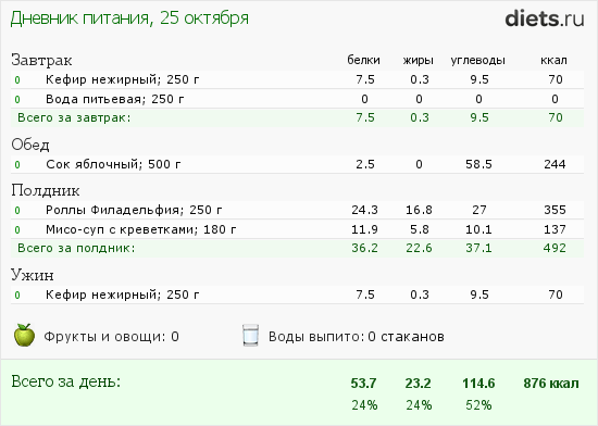 а так обычно весь день кефир, 2 яйца и грамм 100 курицы. И мне казалось еще, что я много ем. Так что попривыкла.