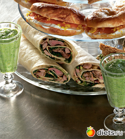 И напоследок – коктейль из зеленых овощей, то, что называется модным словом «смузи»; без такого блюда приличный обед в Нью-Йорке почти не представим. Примерно такой же салат, как в нашем меню, подается в кафе «Тини», открытом довольно известным поп-музыкантом Моби. Различие – в сортах используемой зелени. Мы купили ее на вьетнамском рынке в районе метро «Тульская»: нечто, очень похожее на рукколу, только сочнее, мята с ярким привкусом лимона и длинные листья тайского кориандра, отдающего фиалкой.