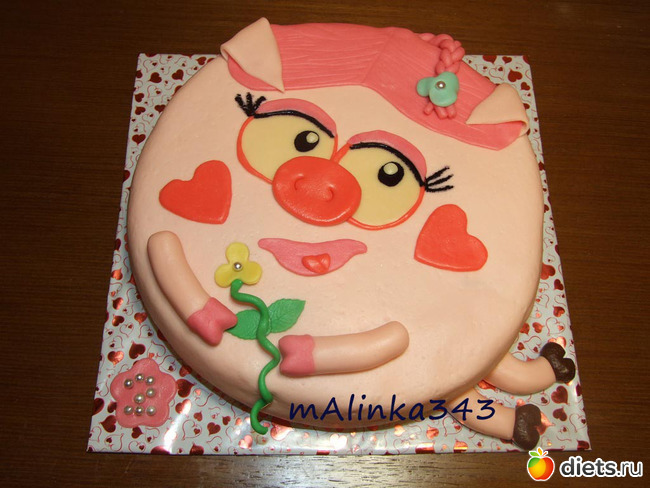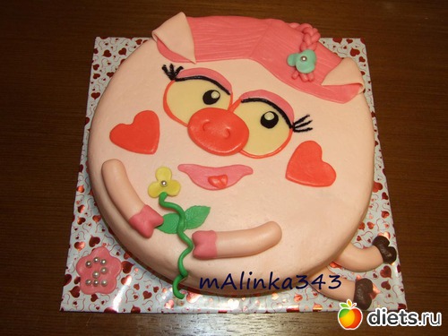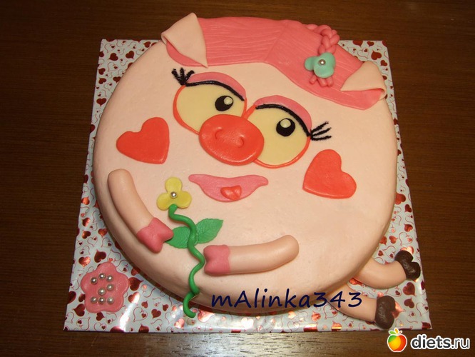 Вчера я написала ей комментарий под ее тортиком Нюша, что видно мода у девочек 2хлет тортики-свинюшки, на что ее мама написала мне "Иди к себе рекламируйся, а не тут"... Я не понимаю, причем тут реклама? У нас в городе нет мастеров, работающих с мастикой, это неблагодарное занятие. Надо либо ставить выше цены (как в кондитерских, но спроса на них нет почти), либо просто любить это дело и иметь минимальный доход. И я и она занимаемся этим ночами, заказы есть, хоть один в неделю точно. А много и не возьмешь, спать-то надо, а на торт минимум 2 дня уходит.