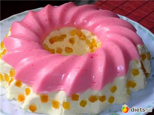 Пока застывает, делаем творожное желе. Сливочное масло растереть с сахаром и желтками до образования пены. Продолжать взбивать, добавляя понемногу творог. Желатин растворить в горячем молоке, слегка остудить и перемешать с творожной массой. Выложить творожную массу в форму сверху ягодного желе.