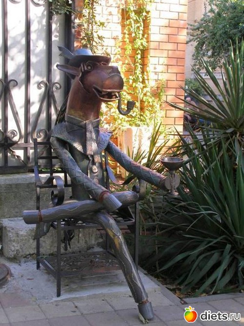 Вальяжный конь в дорогом английском пальто, с чашей вина в левом копыте и фирменной трубкой в прокуренных лошадиных зубах, сидит, вытянув передние конечности. Конь улыбается широкой лошадиной улыбкой: жизнь, мол, удалась!