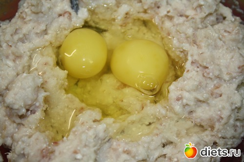 Добавить два яйца, соль- специи, можно зелень по вкусу, размешать: