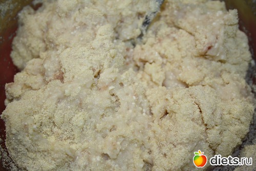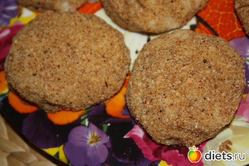 Аккуратно формируем котлетки, сделать это очень сложно- фарш нежный, я выкладывала фарш столовой ложкой в панировочные сухари, обсыпала, а затем формировала котлетки: