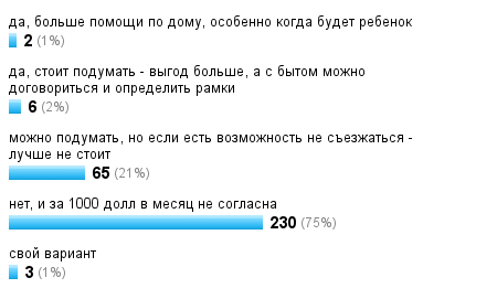 ситуация такая - в общем муж настаивает, чтобы его родители (папа, мама, сестренка), чтобы его мама помогала ухаживать за ребенком (дай Бог, чтобы все было нормально). я категорически не хочу - плюсов конечно море - их квартиру можно будет сдавать, 400-500 долл в месяц, кому не лишние, у нас дом большой, всем места хватит, свекровь не работает, типа будет ужин-обед готовить... за ребенком смотреть...