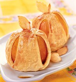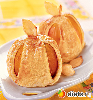 Тесто раскатать и разрезать на 4 квадрата. В центр каждого поместить по яблоку. С четырех сторон яблока вырезать из теста по треугольнику (основанием к яблоку). Соединить треугольники в верхней части яблока. Взбить яйцо. Смазать им тесто. Поставить в духовку и выпекать 15-20 мин.