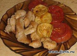 2 куриные грудки, четверть стакана соевого соуса, кусочек корня имбиря длиной 2 см, 2 ст. л. сладкого горчичного соуса, 2 зубчика чеснока, 2 ч. л. красного или зеленого табаско, 2 помидора, 1 цуккини.