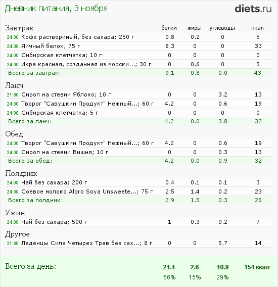Что-то я сегодня сильно накосячила с соотношением белков-углеводов - а все эти гадские леденцы, тьфу! И по калориям совсем мало вышло... Просто кусок в горло не лез почему-то. Наверное, потому, что приехала бабушка, которая несмотря на мои неоднократные объяснения о том, что мне НЕЛЬЗЯ в белковые дни углеводно-жировые нямки, буквально пихала в рот всякую фигню. Вот вроде взрослый человек, должна понимать, что я себя так ограничиваю не потому, что капризничаю, а потому, что мне просто необходимо возвращать свой метаболизм в нормальное русло, и ее попытки меня раскормить, если бы увенчались успехом, отдалили бы меня от цели далеко и надолго.
