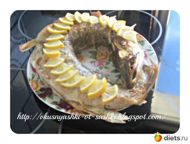 Затем переложим рыбу в более тесную посуду и польем сметаной. Накроем крышкой и запечем около 45-60 минут при 150 градусах, до готовности.