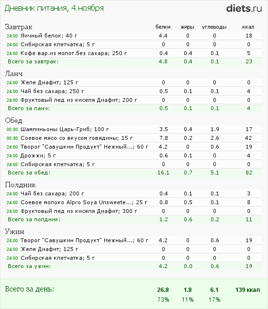 другое - чай с молоком (разве что с обычным, а не с соевым - день все-таки углеводный), 2 леденца без сахара, кисель и желе Диафит