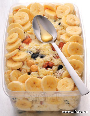 Смешать творог, йогурт, изюм, орехи и овсяные хлопья. Выложить массу в лоток, накрыть ровным слоем порезанных бананов и полить медом.