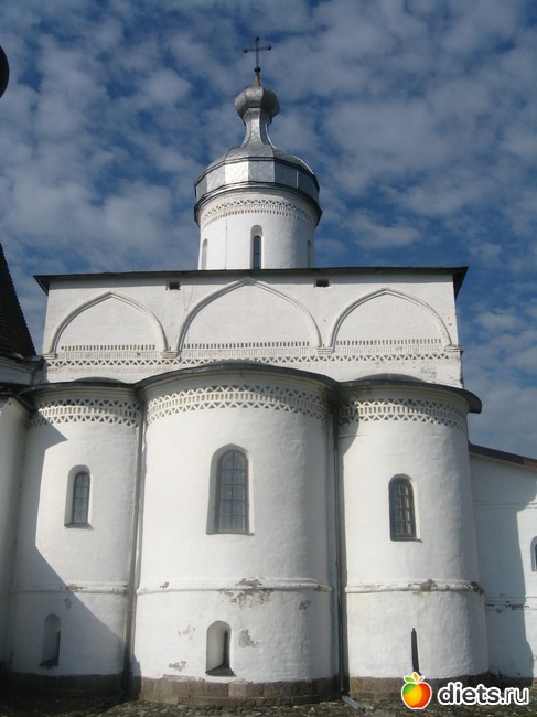 Следующая остановка была у Ферапонтова монастыря, в котором сохранились фрески Дионисия. Находится он между двумя озерами, соединенными маленькой речкой. Основан он был в 14 веке монахом Ферапонтом. Здесь 10 лет в ссылке провел патриарх Никон.