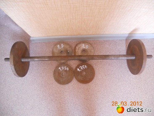 лепёшки по 1.9кг и по 1.75кг, большие блины по 6кг, ещё есть гриф побольше 6.5кг и "гантели" в кавычках потому что это не гантели а железные петли на ворота весом по 1.8кг, сфотать не могу, что-то у меня с фотоаппаратом не то, пишет, что карту использовать нельзя...