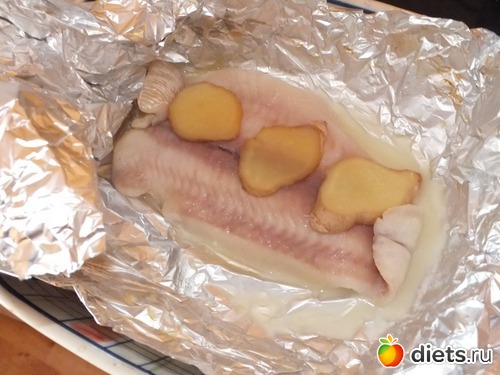 На обед запекла рыбку сверху положила имбирь и лимон (после приготовления убрала)