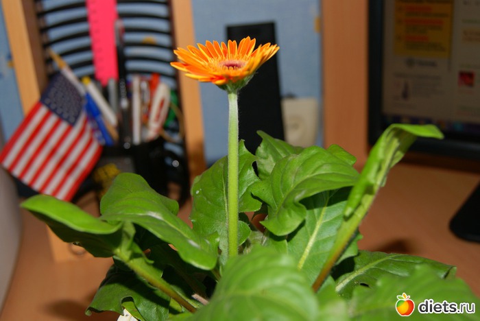 когда растение появилось у меня в квартире, на нем было 2 цветка, оба цвели, поставила я горшочек на западное окно, но на прямых солнечных лучах цветки падали и листья вяли, я начала поливать в поддон и стала убирать растение с прямых солнечных лучей, потом цветки окончателно засохли, я их обрезала и оставила растение доживать 2 недели, через которые можно пересаживать герберу, по истечении примерно 10 дней я с радостью обнаружила, что появились 2 стрелки, когда минуло 2 недели, я герберу пересадила в горшок побольше, правда, с горшком немного не угадала - полив в поддон не получится, горшок керамический, поддон мелкий, полила в край горшка, чтобы вода на розетку листьев не попала и вот, что я увидела сегодня утром