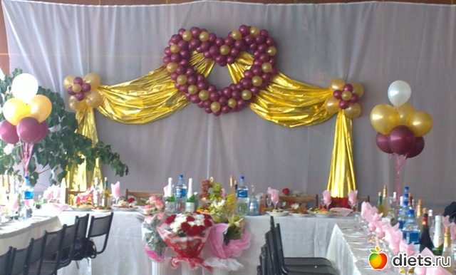 Самым сложным для меня было оформление помещения по аналогии с фото. Начальник обещал, что мне помогут, но внутренний голос говорил, что фиг вам. Поэтому я уговорила сестру помочь мне. На месте не оказалось ни стремянки, ни стола, ни обещанной шторы. Уже потом, через некоторое время, пришли заказчики и повесили ткань, на которую можно было крепить. Высота потолка оказалась четыре метра. Вдвоем, мы более-менее справились. Один лез на стену, другой держал его. Крепили на леску и скрепки к ткани. Для фалд использовали полисилк, он обычно продается в цветочных магазинах, где торгуют упаковкой для цветов. Он очень сильно мнется, да и рулон стоит 1500 рублей, потому лучше купить ткань. В любом случае, фирма предоставила мне все необходимые материалы. Для шаров, которые рядом со столами я сделала грузики из шариков с водой и обернула красивой оберткой.