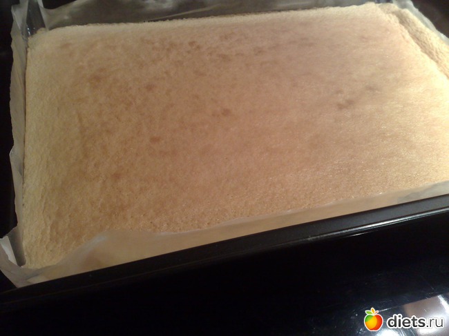 Вот такой корж я вынула. Переверните бисквит на решетку и снимите бумагу. Правда масло на бумагу наливала совсем чуть-чуть, потому местами бумага отходила плохо. Но это не важно, сверху потом мусс выкладывался...
