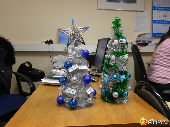 Итак сама елка готова. Осталось только украсить еслку игрушками. Но тут ничего сложного покупаете любой набор игрушек и вместо веревочки на подвеску делаете канцелярские скрепки и подвешиваете на мишуру. На все про все у меня вышло не более 30 минут. Поэтому фоток с промежутком работы нет. Еще я сделала такие: