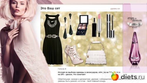 Еще зарегистрировалась на сайте космополитан. А там у них конкурс о том настолько ты ангел или демон (это в поддержку продажи тех духов, о которых я вчера писала). Нужно составить свой набор вещей и косметики, который тебе близок по характеру из списка. Вот, что у меня получилось: