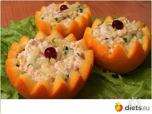 Салат с куриным филе и огурцами в апельсине, на 100 г 80ккал 3-4 апельсина
