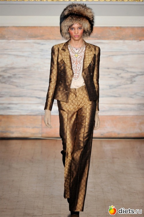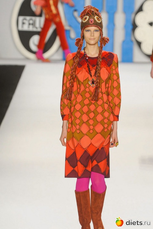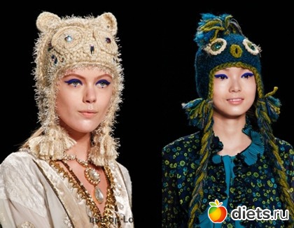 Агрессивные цвета и фасоны Anna Sui встречены с восторгом любительницами авангарда. Множество мелких деталей придает шарм вязаным модным шапкам 2012—2013.