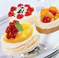 5. Готовые безе переложить на блюдо. Украсить взбитыми сливками и консервированными фруктами. Хорошо смотрятся пирожные, собранные из белой и шоколадной половинок.