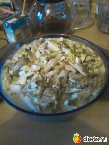 Кладем на дно формы обжаренный лук. Заливаем 100 мл. молока (просто зеленого лука у меня было мало, потому и экономила. Если у вас лука будет достаточно, то можно залить уже смешанным соусом).