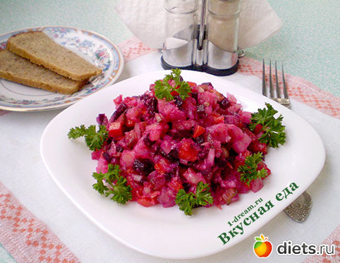 Ну а лук репчатый можно пошинковать мелко, чтобы он равномерно распределился по всему винегрету. :