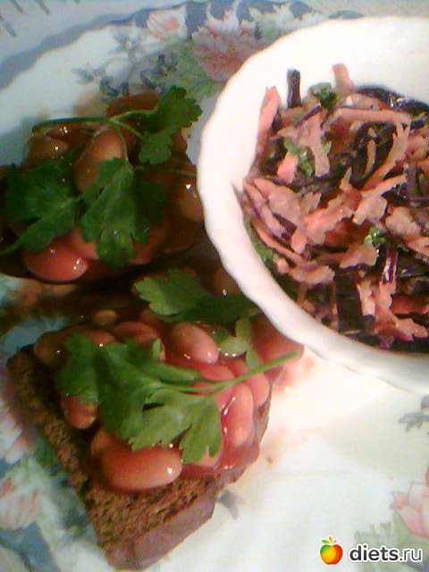 А послал он мне 2 тоста с фасолью в томате и остатки салата из морковки и красной капусты: