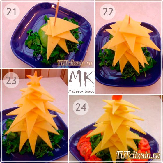 Идея довольно простоя в исполнении, так что с ней будет по силам справиться каждой домохозяйке. Делать такие елочки можно из чего угодно, а на новогоднем столе они будут смотреться нарядно, эффектно и натурально. Подобные ёлки (особенно небольших размеров) могут стать украшением различных блюд и закусок.