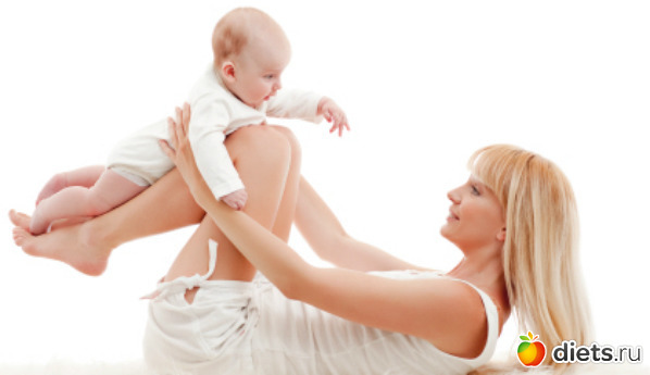 Упражнение № 5: лягте на спину, ноги согните в коленях. Малыш обхватывает ваши икры, вы начинаете поднимать ноги, придерживая его за плечи.