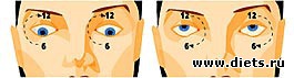 Представьте, что вы стоите близко к большим настенным часам, центр которых расположен прямо перед вашими глазами. В начале упражнения взгляд устремлен в центральную точку. Затем, не поворачивая головы, бросьте взгляд на любую из цифр на циферблате, а затем так же быстро вернитесь в центр. Теперь бросьте взгляд на следующую цифру и вернитесь в центр. В целом необходимо обойти по данной методике весь циферблат по и против часовой стрелки.