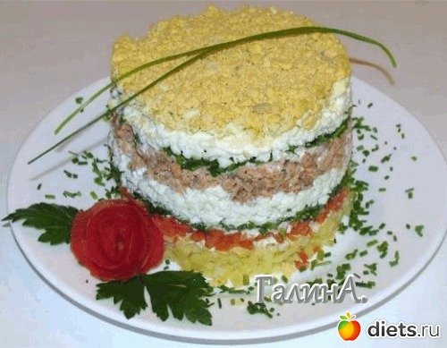 Слоить этот салат можно сколь угодно много (увеличив пропорции ингредиентов).