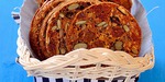 В большой миске смешайте муку, овсяные хлопья, соду, специи и соль. Добавьте йогурт, коричневый сахар и мед, перемешайте. Затем добавьте изюм, орехи, кунжут и семечки, перемешайте.