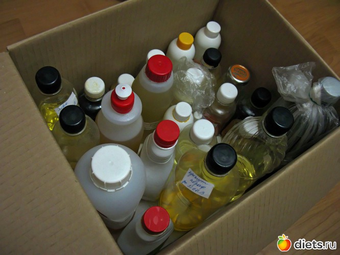 Решила с вами поделиться запасами моих масел. У меня их целая коробка! И в холодильнике еще килограмма 4-5. Да, они разлиты в пластиковые бутылки. Нет, они так не портятся. Нет, они не законсервированы и у них маленький срок годности. А в пластике и подписаны рукой они оттого, что куплены совместно с подругами по увлечению, мыльно-кремо-варенному, и таким вот образом поделены. Какие-то масла я брала только для косметики, какие-то только на кухню. Не все масла есть смысл использовать в пищу. Какие-то полезнее внутрь применять, какие-то бессмысленно глотать, но зато невероятно полезно наносить на кожу (в эмульсиях, конечно, использование чистых масел может неблагоприятно сказаться на состоянии кожи). А есть такие, которые можно и в кулинарии использовать, и в косметике. Ну, вот к примеру, масло жожоба очень ценное косметическое масло, но глотать его совершенно бессмысленно - никакой пользы, хоть и вреда также никакого. Масло мака хорошо принимать на ночь по чайной ложке - оно успокаивает, поможет заснуть, будет полезно при спазмах кровеносных сосудов, гипертонии, мигрени и стенокардии. Масло кунжута кроме того что очень вкусное и послужит прекрасной заправкой для многих салатов, обладает общеукрепляющим действием на весь организм и глистогонным на мелких гадиков