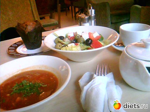 а вот на обед заскочила в "Шоко", уловчик: фасолевый суп, греческий салат без масла, ржаной маффин и зеленый чай: