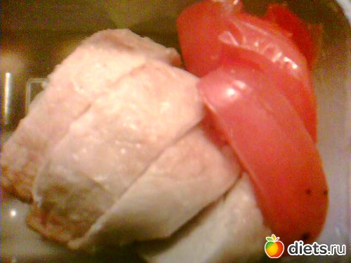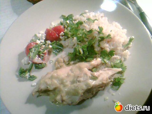 Ужин был гораздо скромнее. Пара ложек бурого риса, курица по-осетински (отварная грудка в молочно-чесночном соусе с красным перцем и травками) и остатки шпинатно-помидорно-творожного салатика: