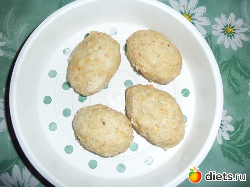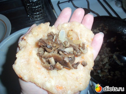 Брать ложкой порцию, скатать шарик, потом распластать его на ладони (руки смочить водой, чтобы не липло)