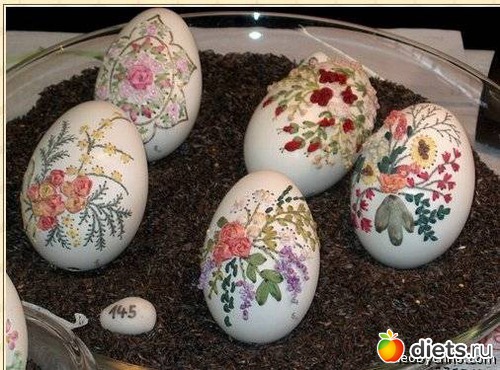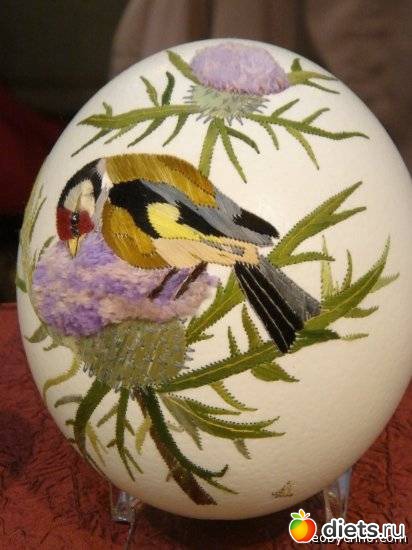 Такое рукоделие называют «Поэзия на яйце». Сложность заключается еще и в том, что вышивка происходит без разрушения яйца, то есть форма яйца сохраняется. А продевание нитки с иголкой происходит через крошечную дырочку в дне яйца.
