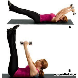 Возьмите гантели, лягте на спину, руки с гантелями заведите за голову, но не опускайте на пол.