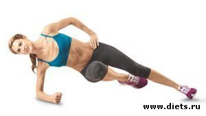Исходная позиция и начало – так же, как и в предыдущем упражнении. После того, как ваше тело будет представлять собой единую прямую линию, положите правую руку на бедро, поднимите левую ногу и согните в колене. Теперь вес вашего тела приходится на левое предплечье и внутреннюю часть правой ступни.