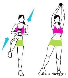 Возьмите гантель обеими руками и поднимите ее над правым плечом, левую ногу немного отставьте в сторону так, чтобы она касалась пола пальцами. Одним движением опустите локти вниз и поднимите левое колено к груди. Можно чуть коснуться коленом гантели. Затем выполните движения в обратной последовательности для возвращения в исходную позицию.