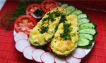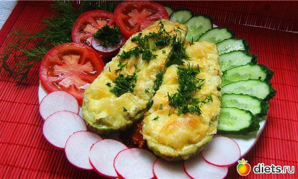 Кабачок очистить от кожуры, перерезать пополам и ложкой выскрести сердцевину. Отложить на время, а пока нарезать мелко лук и слегка обжарить, туда добавить натертую на терке мелкой морковь. Сердцевину мелко порезать и добавить к луку.2-3 гриба мелко порезать и также положить тушиться. Если получится суховатый фарш, то можно добавить 1 помидор или воды. В конце посолить, поперчить и посыпать зеленью. Начиняем этим фаршем кабачек с горкой и поливаем постным майонезом тонкой зигзагой или клеточку рисуем. Форму обмазываем маслом. Выкладываем в форму кабачек, а по бокам укладываем порезанные грибочки в перемешку с помидорами, присолить и посыпать зеленью и печем на 180* до готовности кабачка.