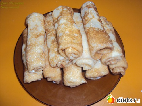Выпекаем, как обычные блины. Начинкой может быть творог.