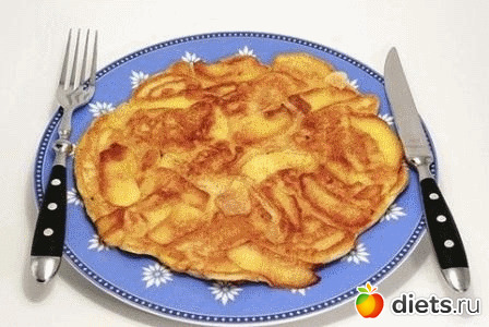 Свежие, не очень кислые яблоки очистить от кожуры, вырезать сердцевину, нарезать тонкими ломтиками и слегка поджарить на масле. На поджаренные яблоки вылить взбитые яйца, перемешать и жарить как обычный омлет.