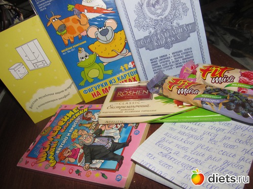 Здесь на сайте есть группа - https://www.diets.ru/community/207711/, в рамках которой мы проводим акцию - обмениваемся адресами и высылаем друг-другу подарки...что то вроде "тайного друга". До последнего никто не знает, от кого ему приедет привет!