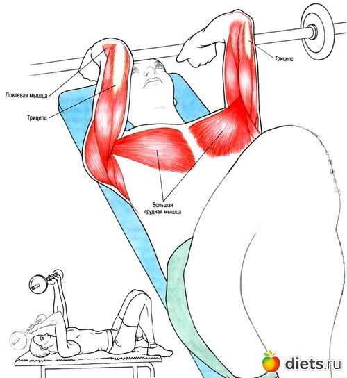 • При выполнении французского жима со штангой лежа, лягте на скамью лицом вверх.