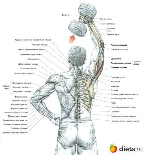 - сделать вдох и согнуть руку в локте, опустив гантель за шею;