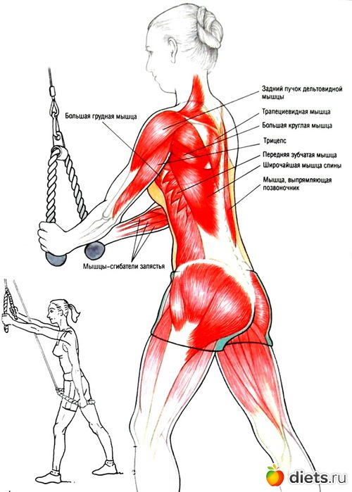 - Стоя лицом к тренажеру. Рукоятку нижнего блока держать хватом снизу